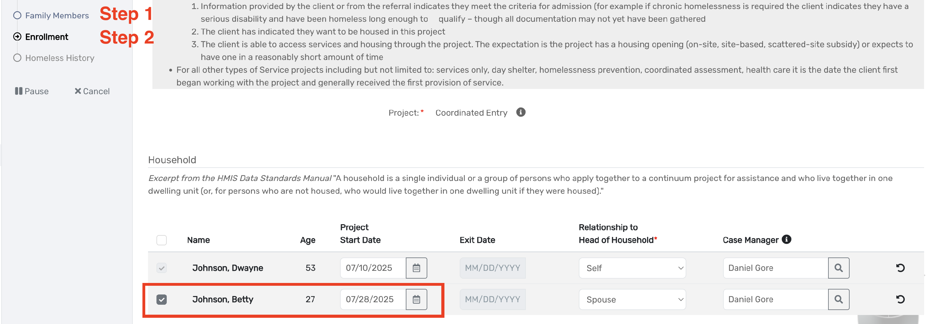 - To enroll a family member for an existing enrollment, find the Head of Household's enrollment, click ADD CASE MEMBER, then enter their start date on the Enrollment screen.